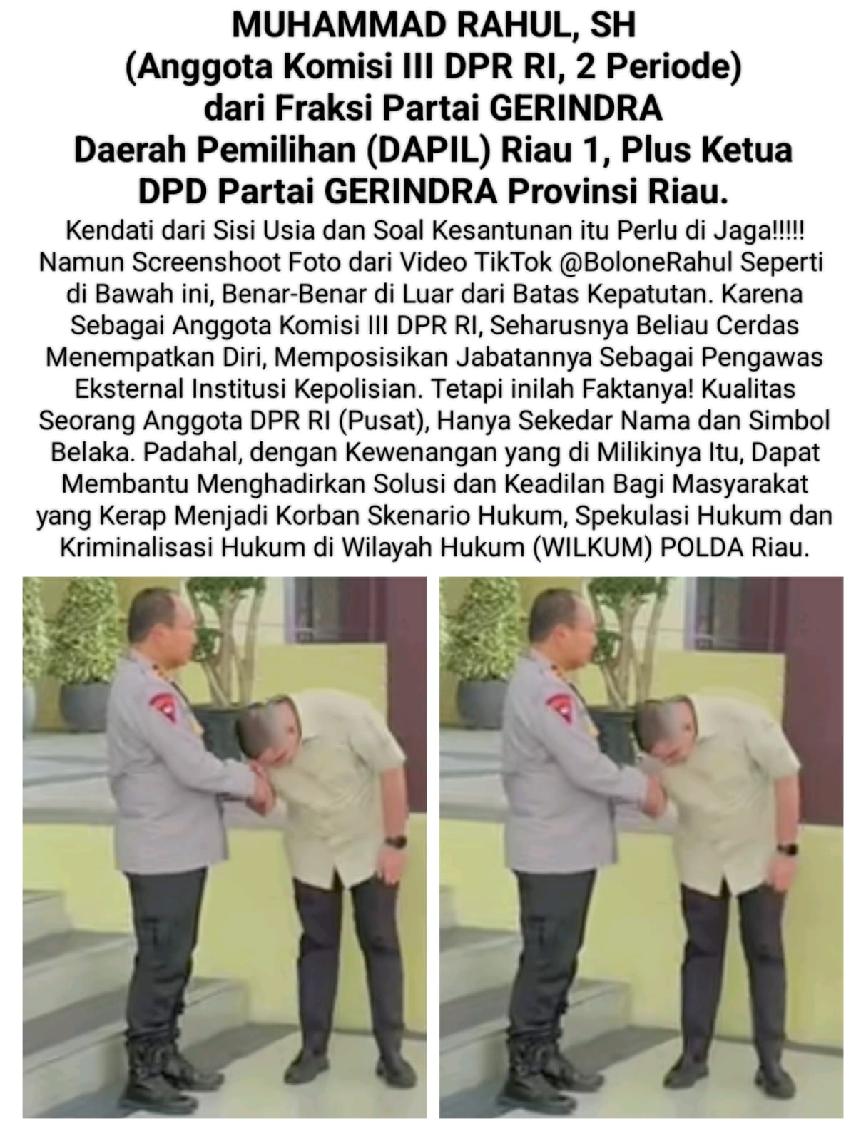 Prestasi Muhammad Rahul hanya sekedar bagi-bagi Sembako, mendatangi korban banjir, lalu foto-foto dan buat video TikTok, setelah itu rajin muji-muji kinerja Kapolda Riau sewaktu Rapat Dengar Pendapat Umum (RDPU) di Ruang Komisi III DPR RI.